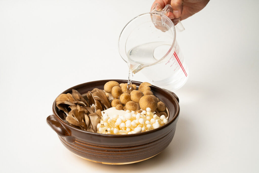 きのこは3種類以上入れると味に深みが出ます。具材は鍋にきれいに並べてから出汁を注ぐと美しい仕上がりに。