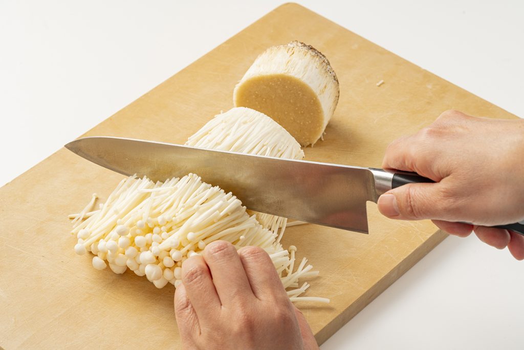 | えのきは根元を落として半分に切り、しめじとまいたけは根元を落として小房に分ける。 | |