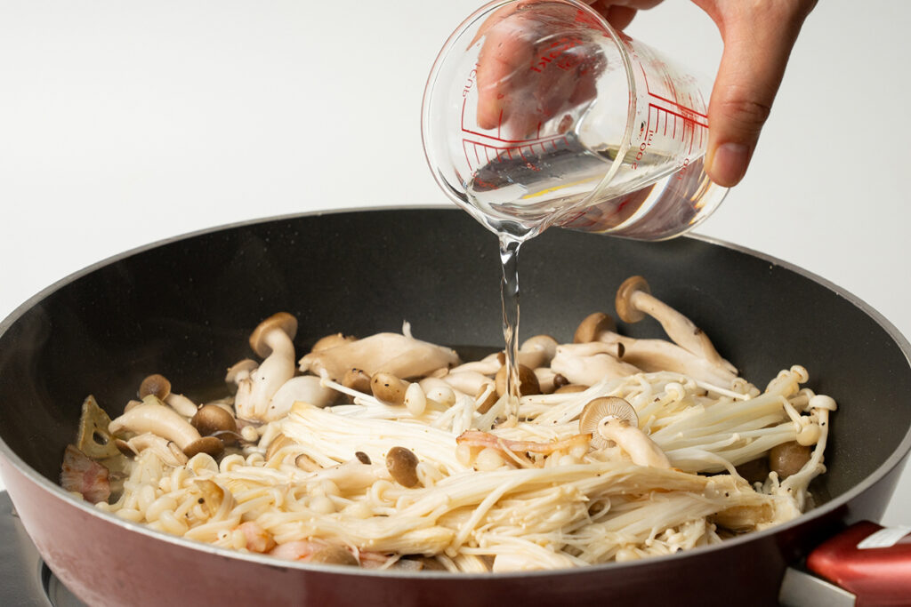 | フライパンに油を熱し、2~3cm幅に切ったベーコン、薄切りにしたにんにく、きのこを加え、塩・胡椒を振り、にんにくの香りが立つまで炒める。 | |