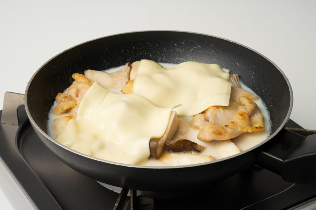 | 牛乳とコンソメ、スライスチーズを加えて弱火にし、チーズが溶けてきたら全体を混ぜ合わせる。 | |